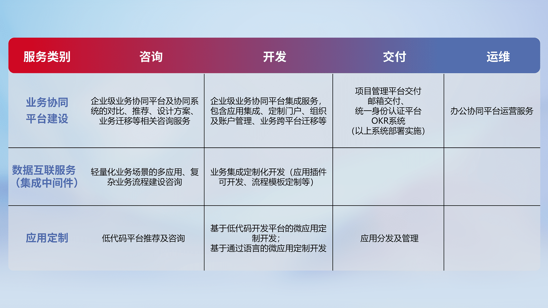 针对钉钉、、、企微、、IDaas等平台级产品提供产品的规划、、、、方案、、、、交付、、、、定制化开发等服务,,,实现如统一协同办公、、智能客户服务、、、、混合会议管理、、、智能数据查询、、、等业务场景,,,,实现数字化转型。。